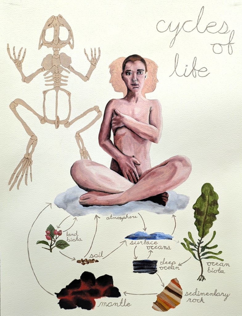 My work explores the human figure and how we understand our place and purpose in the world. I paint recreations of my own body, pushing the boundaries of my own comfortability. I draw upon personal memories and experiences that others can relate to such as shifting religion, addiction, and a disconnect from oneself. I consider the ways in which humans twist and pull apart our natural bodies to fit into what current society demands of us.